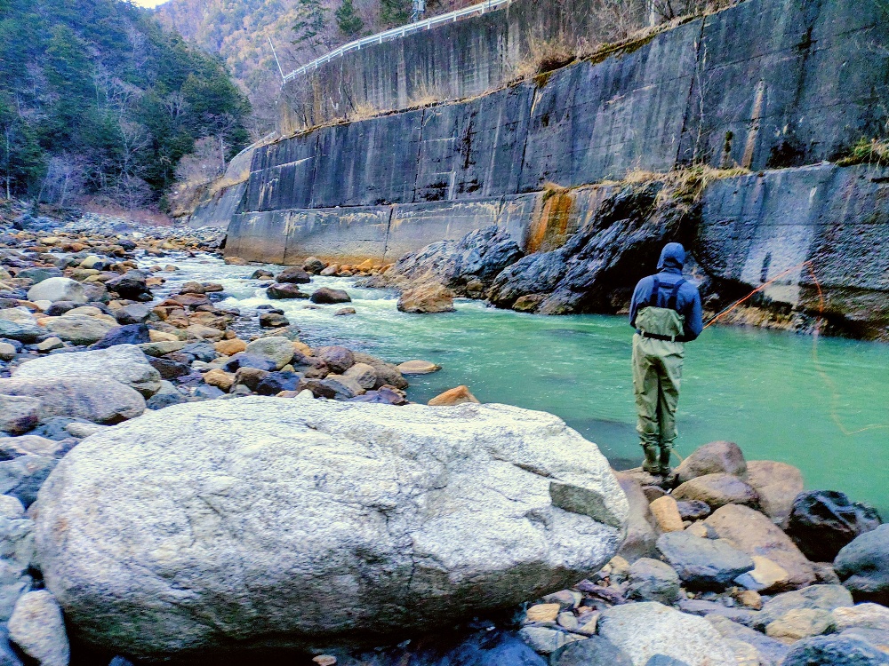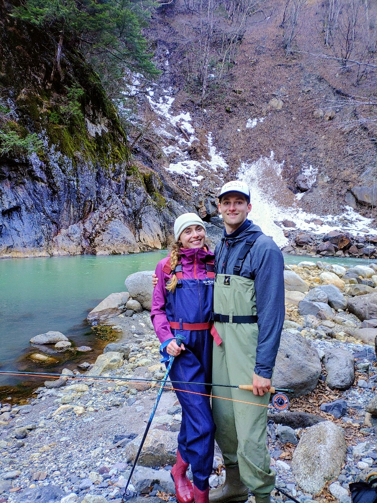 The other day, I was surprised by a sudden request, but I had the opportunity to guide a wonderful couple from America, Finn and Hana, and help them enjoy a fishing trip in Japan. They came to Japan for snowboarding and sightseeing, but along the way, they saw the beautiful rivers of Hida Takayama and suddenly wanted to try fishing. In order to respond to their enthusiasm, I served as their fishing guide.